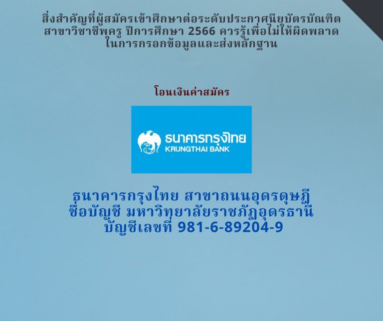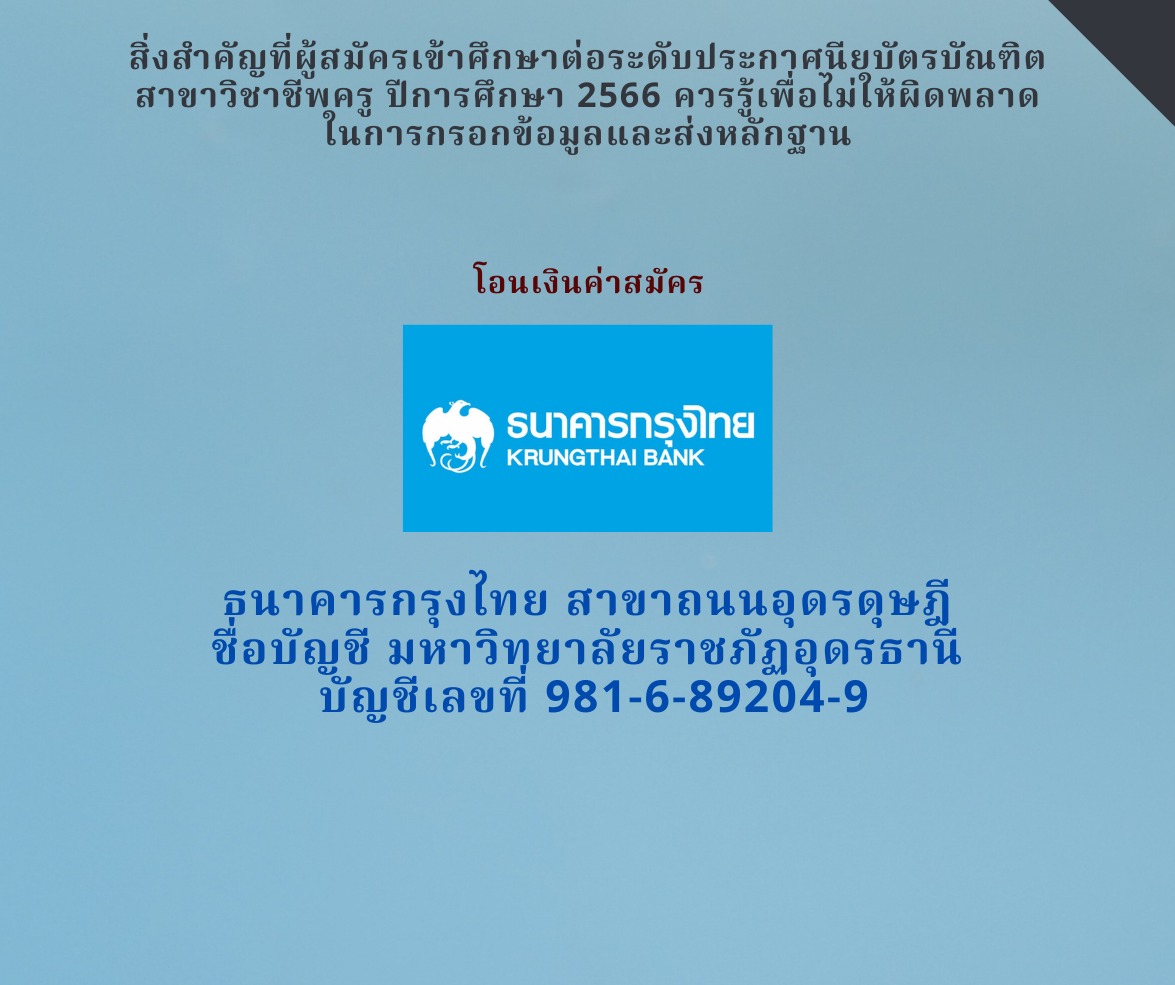 เมื่อดำเนินการขั้นตอนการสมัครเสร็จสิ้น ให้ทำการโอนเงินค่าสมัครมาที่ ธนาคารกรุงไทย สาขาถนนอุดรดุษฎี ชื่อบัญชี มหาวิทยาลัยราชภัฏอุดรธานี บัญชีเลขที่ 981-6-89204-9