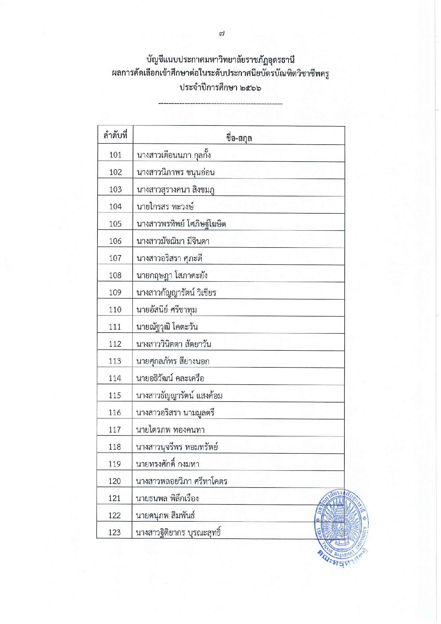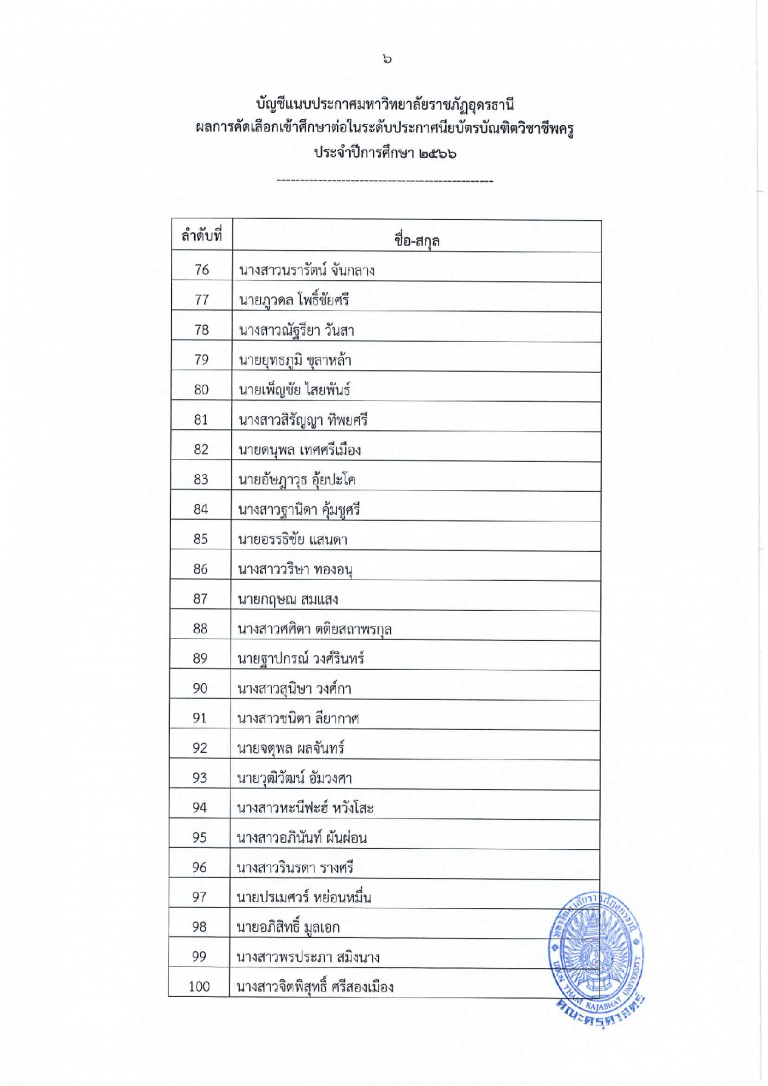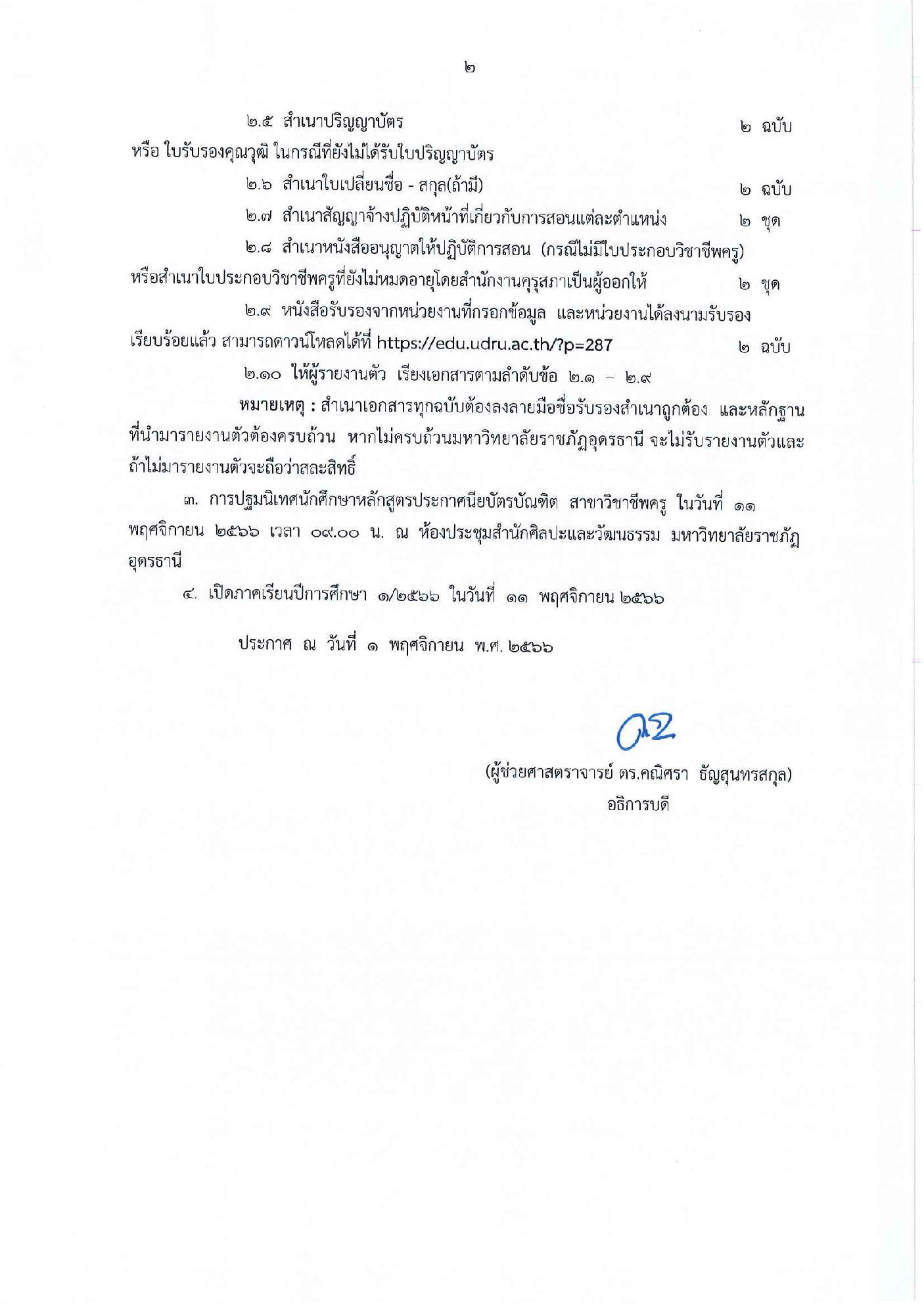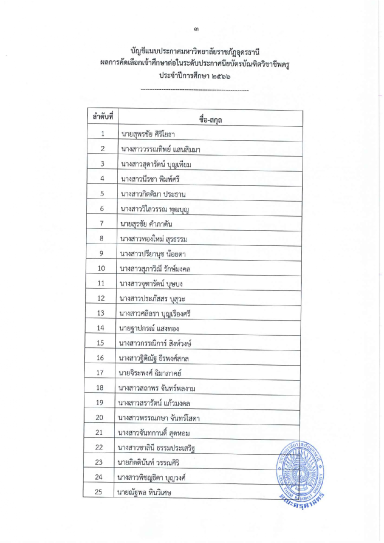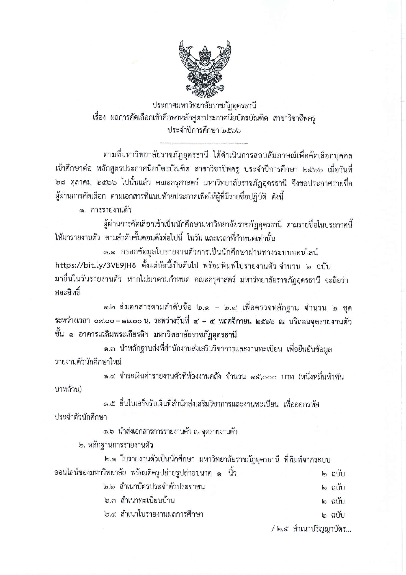 ประกาศมหาวิทยาลัยราชภัฏอุดรธานี เรื่อง ประกาศรายชื่อผู้มีสิทธิ์รายงานตัวเพื่อเข้าศึกษาในหลักสูตรประกาศนียบัตรบัณฑิต สาขาวิชาชีพครู ปีการศึกษา ๒๕๖๖