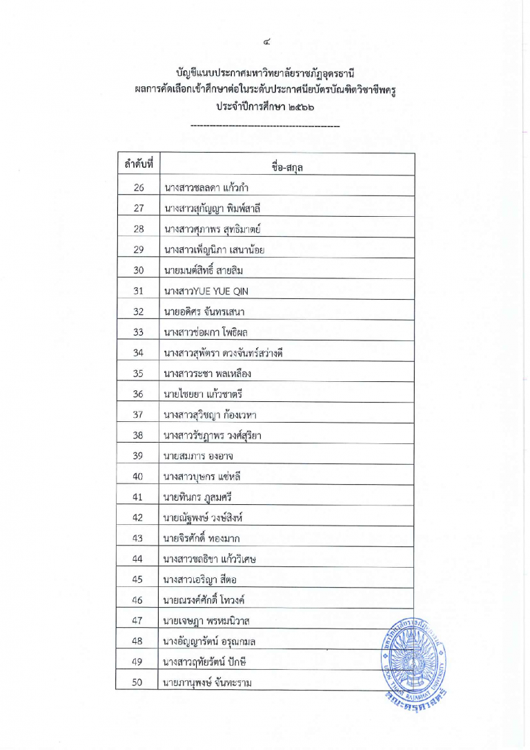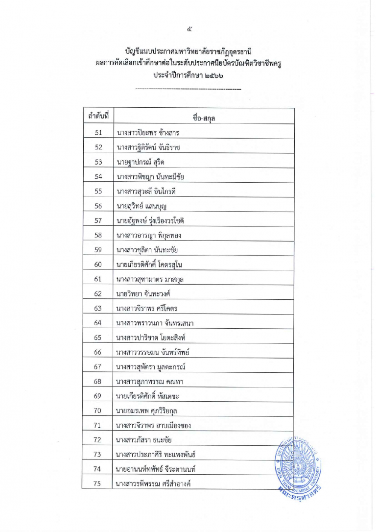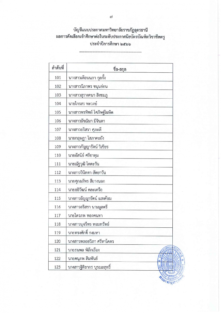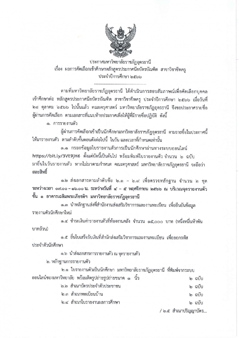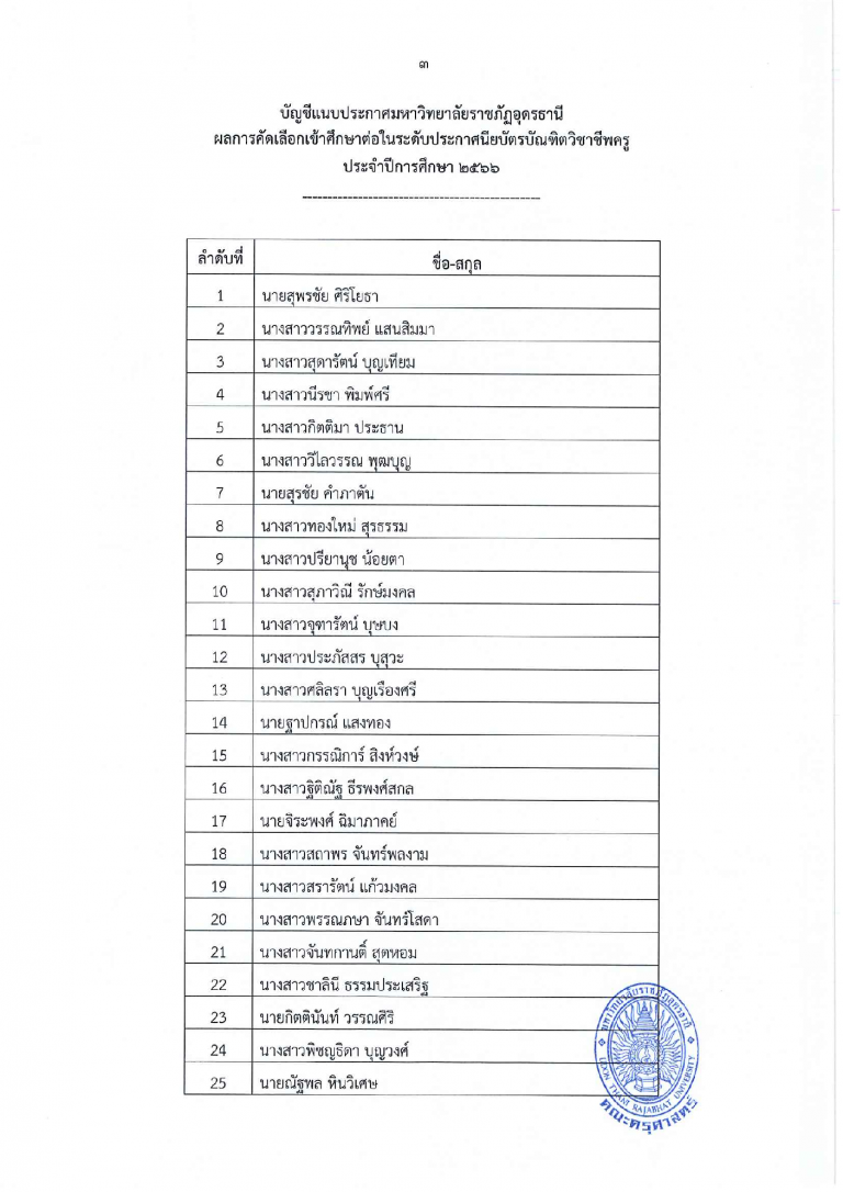 ประกาศมหาวิทยาลัยราชภัฏอุดรธานี เรื่อง ประกาศรายชื่อผู้มีสิทธิ์รายงานตัวเพื่อเข้าศึกษาในหลักสูตรประกาศนียบัตรบัณฑิต สาขาวิชาชีพครู ปีการศึกษา ๒๕๖๖