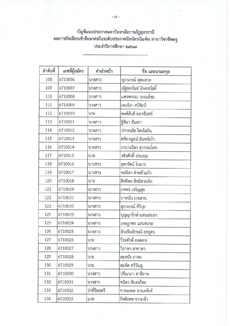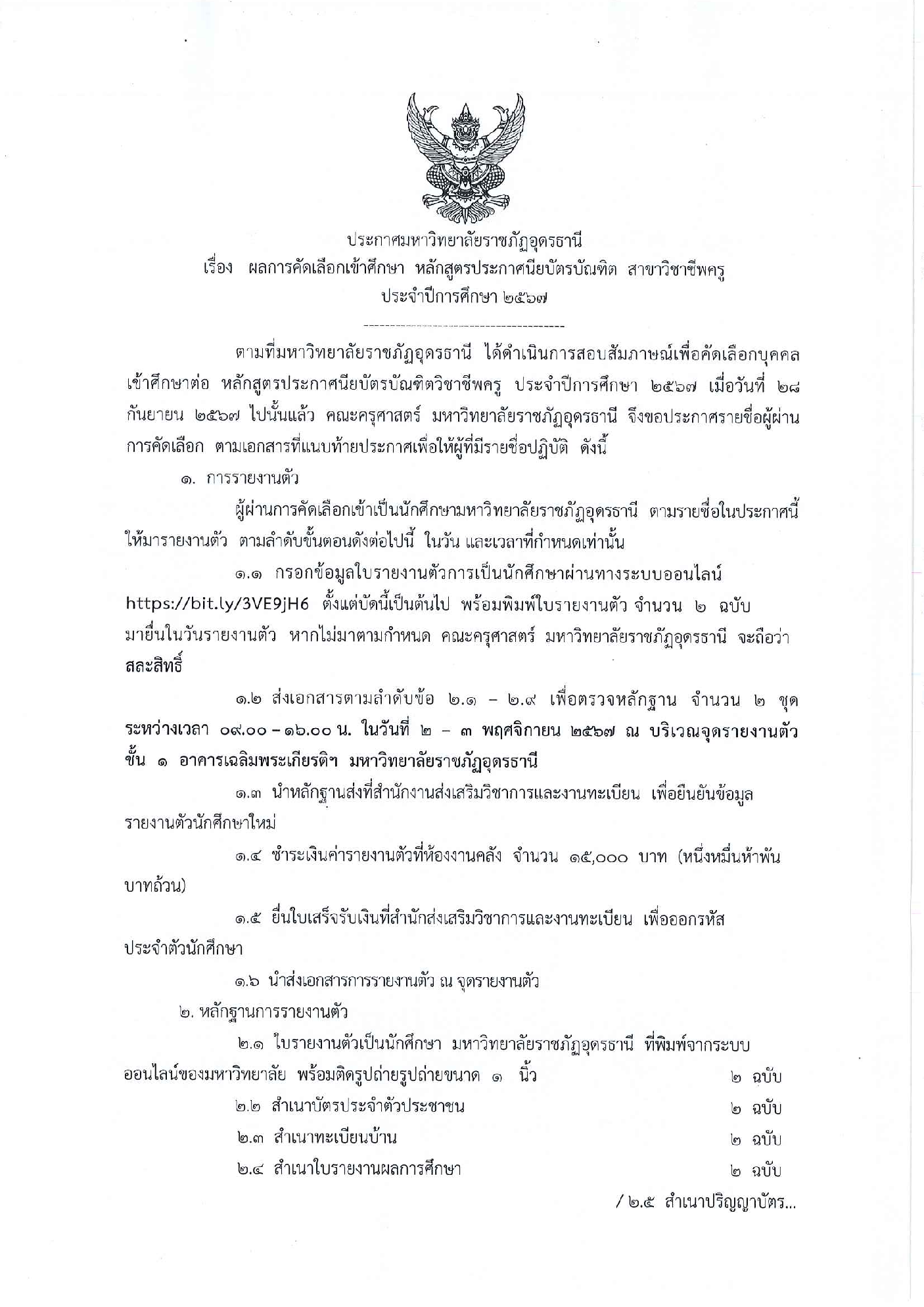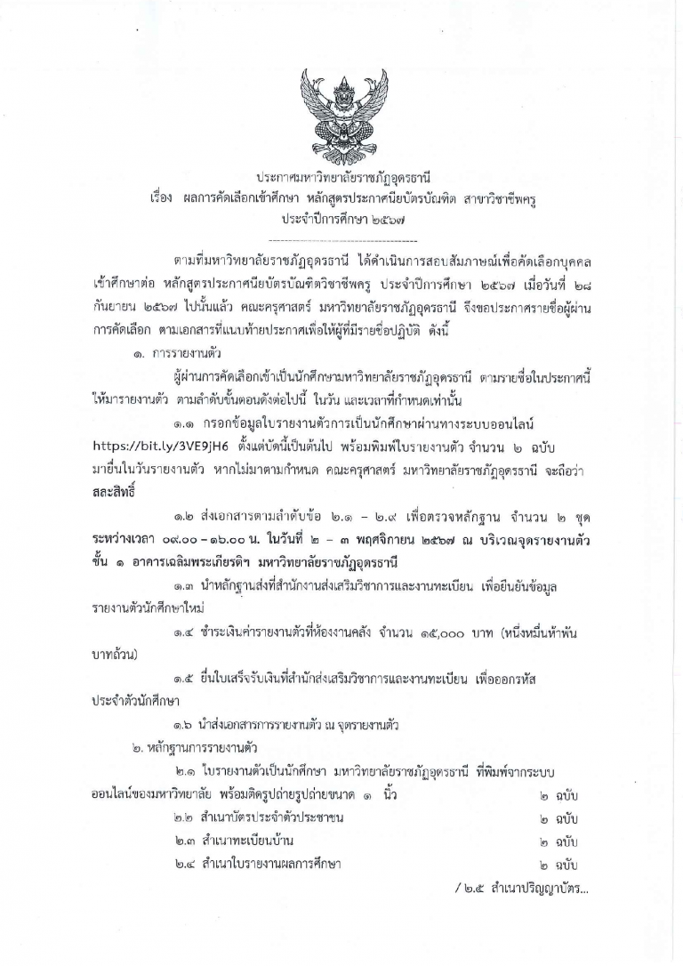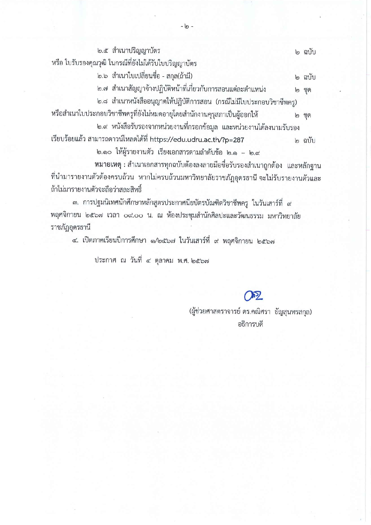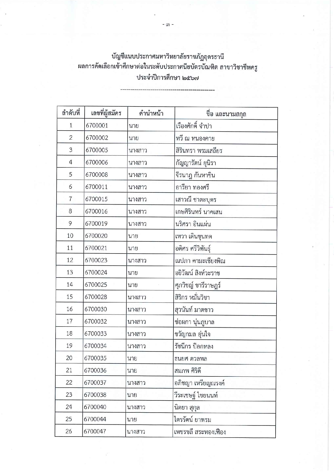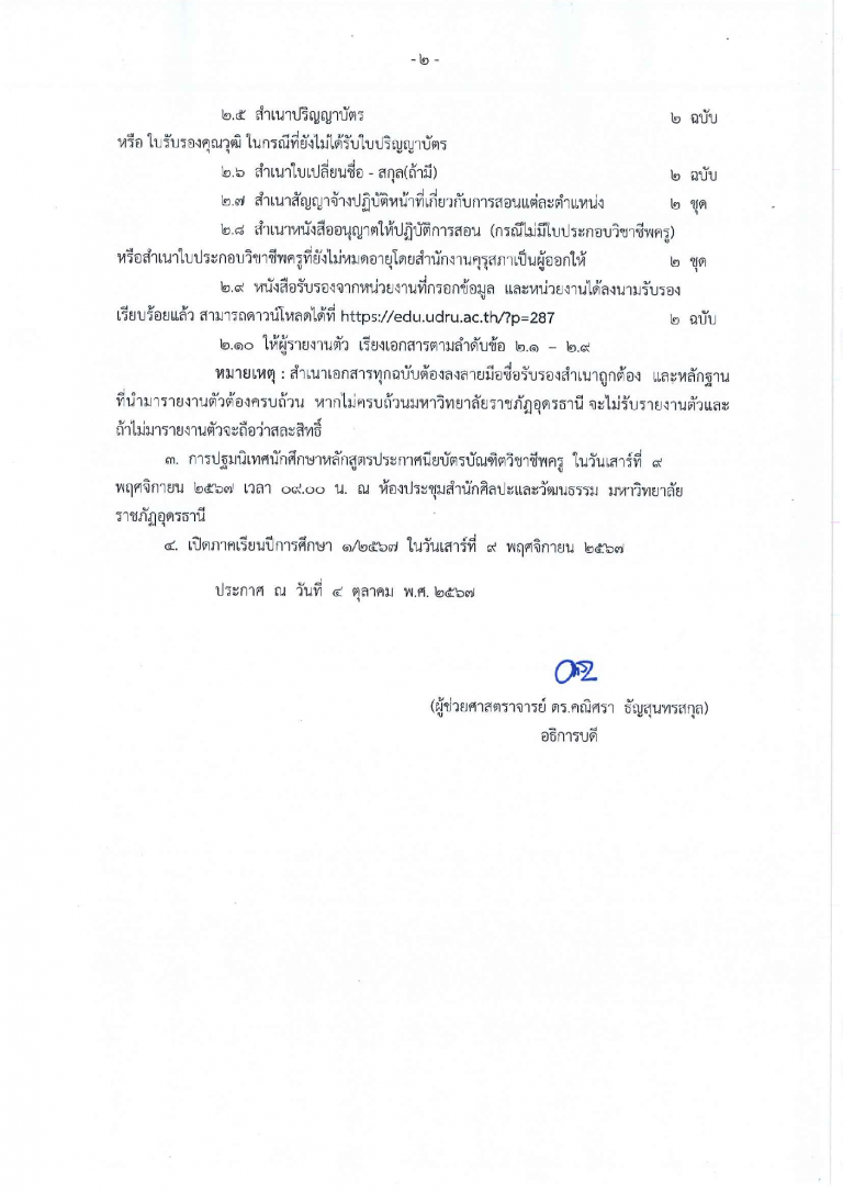 ประกาศผลการคัดเลือกเข้าศึกษา หลักสูตรประกาศนียบัตรบัณฑิตสาขาวิชาชีพครู ปีการศึกษา ๒๕๖๗ ตามที่มหาวิทยาลัยราชภัฏอุดรธานี ได้เปิดรับสมัครบุคคลเข้าศึกษาต่อระดับบัณฑิตศึกษา ปีการศึกษา ๒๕๖๗ หลักสูตรประกาศนียบัตรบัณฑิต สาขาวิชาชีพครู ระหว่างวันที่ ๒๐ พฤษภาคม – ๒๐ มิถุนายน ๒๕๖๗ และขยายเวลาการรับสมัครเข้าศึกษาต่อระดับประกาศนียบัตรบัณฑิต สาขาวิชาชีพครู ปีการศึกษา ๒๕๖๗ ระหว่างวันที่ ๒๑ มิถุนายน – ๑ กันยายน ๒๕๖๗ ไปแล้วนั้น คณะกรรมการดำเนินการได้ประชุมพิจารณาคุณสมบัติของผู้สมัครแล้ว จึงประกาศผลการคัดเลือกเข้าศึกษา หลักสูตรประกาศนียบัตรบัณฑิตสาขาวิชาชีพครู ปีการศึกษา ๒๕๖๗ ตัวอย่างหนังสือรับรอง