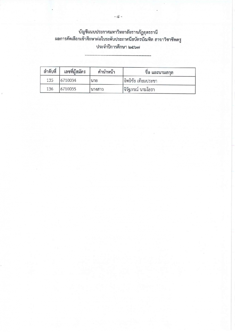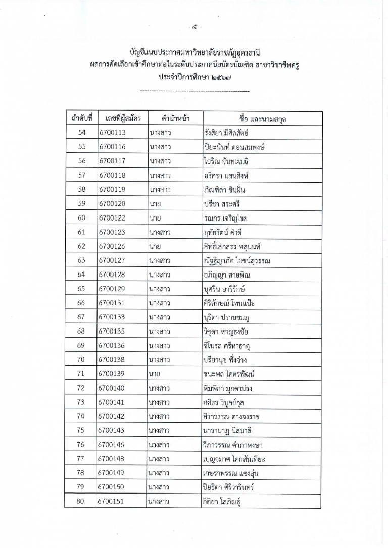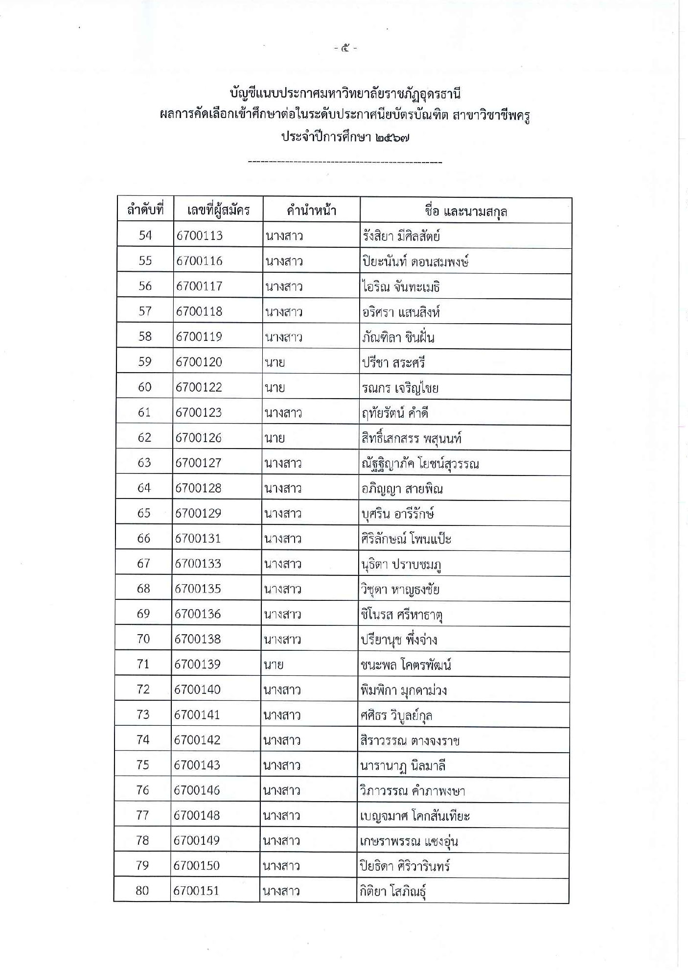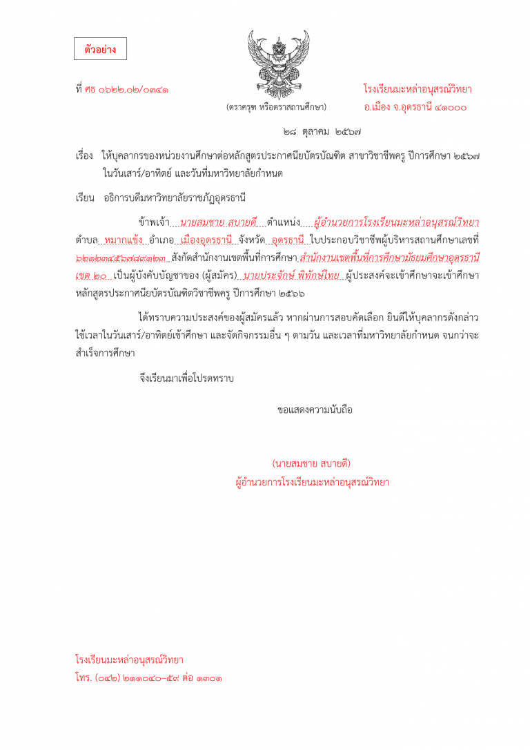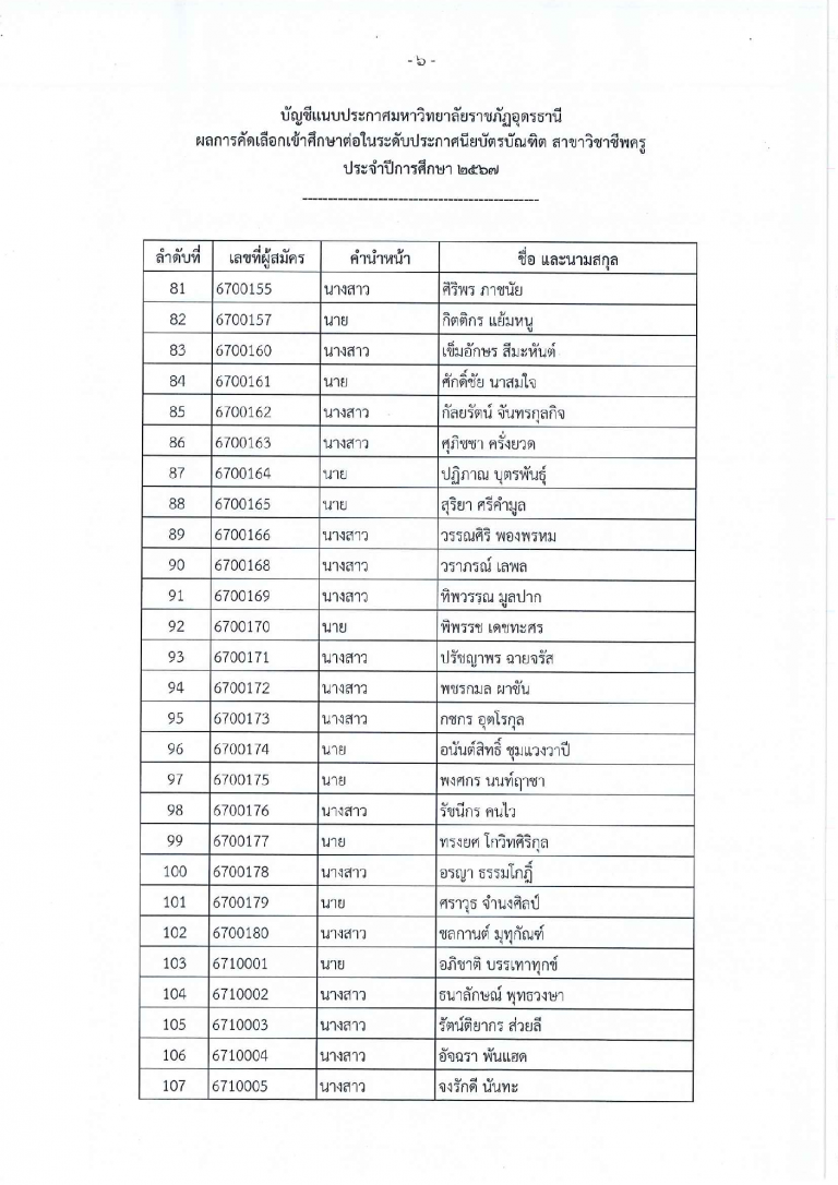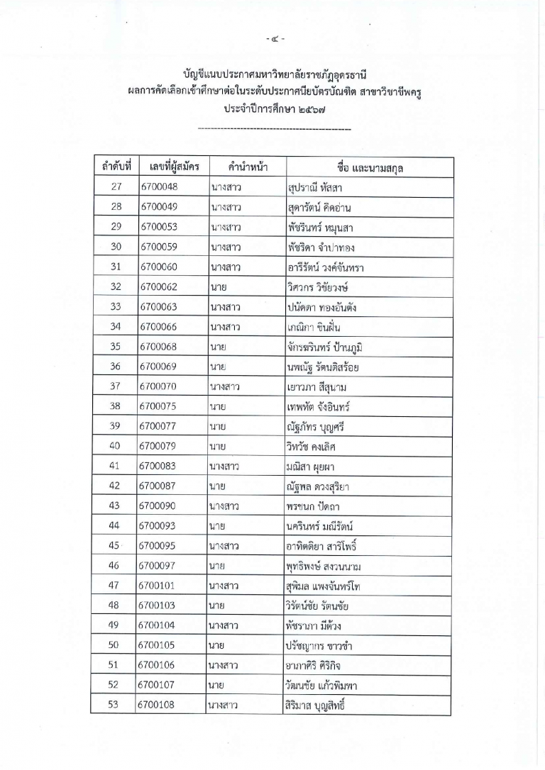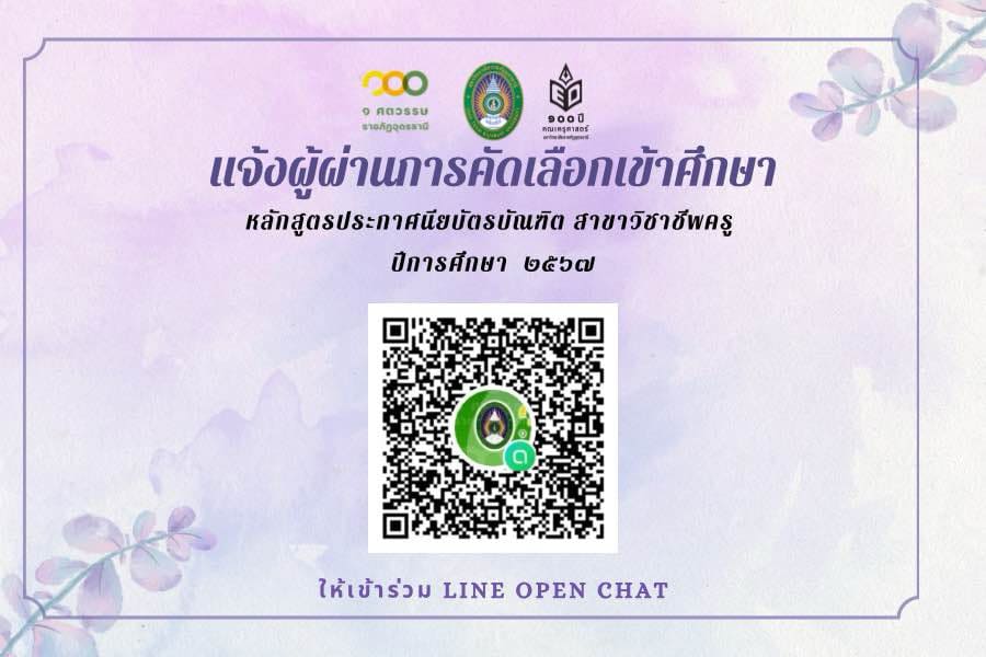 ประกาศผลการคัดเลือกเข้าศึกษา หลักสูตรประกาศนียบัตรบัณฑิตสาขาวิชาชีพครู ปีการศึกษา ๒๕๖๗ ตามที่มหาวิทยาลัยราชภัฏอุดรธานี ได้เปิดรับสมัครบุคคลเข้าศึกษาต่อระดับบัณฑิตศึกษา ปีการศึกษา ๒๕๖๗ หลักสูตรประกาศนียบัตรบัณฑิต สาขาวิชาชีพครู ระหว่างวันที่ ๒๐ พฤษภาคม – ๒๐ มิถุนายน ๒๕๖๗ และขยายเวลาการรับสมัครเข้าศึกษาต่อระดับประกาศนียบัตรบัณฑิต สาขาวิชาชีพครู ปีการศึกษา ๒๕๖๗ ระหว่างวันที่ ๒๑ มิถุนายน – ๑ กันยายน ๒๕๖๗ ไปแล้วนั้น คณะกรรมการดำเนินการได้ประชุมพิจารณาคุณสมบัติของผู้สมัครแล้ว จึงประกาศผลการคัดเลือกเข้าศึกษา หลักสูตรประกาศนียบัตรบัณฑิตสาขาวิชาชีพครู ปีการศึกษา ๒๕๖๗ ตัวอย่างหนังสือรับรอง
